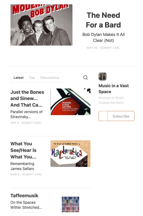 I’ve largely retired from Fanfare, and now am devoting my critical faculties to an ongoing Substack titled “Music in a Vast Space”. My aim is to post roughly once a month, with an essay on a topic that’s interesting to me and hopefully to you. I want it to be something of enough depth and breadth to justify your taking the time to read it, and I see it as an open-ended essay set that may open you up to musical works, creators, and concept you might not have previously considered. (Though I know many of you are more literate than me!)